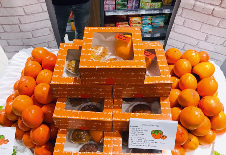 Aufgrund der schwierigen Bedingungen hinsichtlich der Coronapandemie, war bei der diesjährigen Azubi-Challenge Einfallsreichtum gefragt, schließlich galt es, die Kaki ohne die sonst gewohnte Verkostungsaktion im Markt kreativ in Szene zu setzen. Mit eigens hergestellten verführerischen Kaki-Götterpaketen, die im Markt verkauft worden sind, haben Jendrik Noah Pralow und Joeann Lea Brosda nicht nur eine coronagerechte Alternative für die entfallene Verkostung gefunden, sondern gleichzeitig auch bei den Marktbesuchern die Lust auf Kaki entfacht. Dies spiegelte sich übrigens auch deutlich in gestiegenen Verkaufszahlen wider.